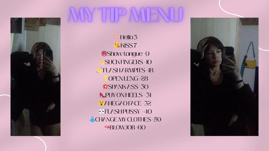 Ahegao, Na pieska, Klapsy, Taniec erotyczny, Palcówka, Dildo lub wibrator, Striptiz, Fetysz stóp, Robienie loda, Masturbacja, Twerking, Anal, Prysznic, Głębokie gardło, Tittyfuck, Kobiecy wytrysk, Kowbojka, Zaglądanie pod spódniczkę, Flashing, Masturbacja stopami, Masturbacja, Szpilki, Topless, Pokaz w oliwie